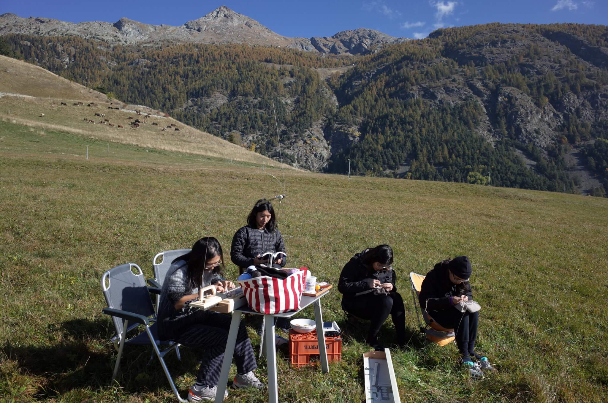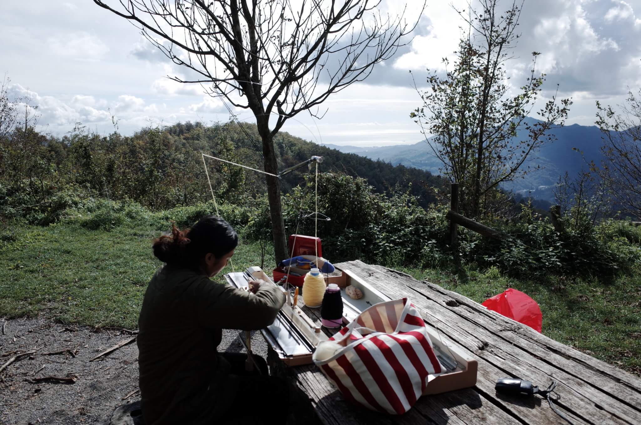 曾與朋友共同發起的計畫「On the Road」,我們把織機搬上義大利和瑞士交界的山腰,露營車載著針織機,展開為期三週的歐洲遊牧生活,尋找當地特有的材料,織成毛帽或襪子。某天清晨,牛群在霧裡移動,我們面對一整片山景織布,完成作品後戴著自己織的毛帽一起下山。人生第一次的遊牧生活體驗,也我深刻感受到「隨地而織」的自由。織物不只是作品,而是讓人聚在一起、讓心重新被整理的方式。